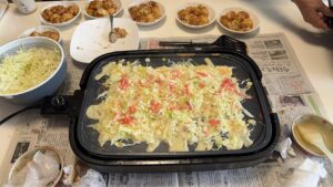 お昼どき、リビングのテーブルに小さな鉄板を置き、今日は世話人の方が、たこ焼きを屋台さながらにふるまってくださいました。