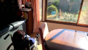 その光の中で、朝の時間を過ごした入居者さんお一人が、椅子に腰かけて、気持ちよさそうに日向ぼっこをしていました。